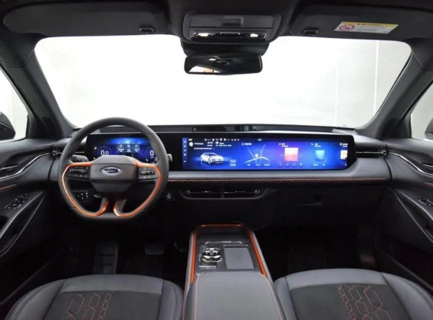 EOVS的内饰采用了12.3+27英寸4K三联屏,其中中控屏与副驾娱乐屏采用了一体式交互界面,配合福特2.0智行互联系统,能够实现主副驾的共同操作。三辐方向盘的样式更加扁平化,换挡旋钮得到保留。同时EVOS还应用了FNV电子电气架构,赋予了它OTA升级功能,并且在升级期间不会黑屏,无需暂停任何正在使用的功能。还有像L2级驾驶辅助系统,基于C-V2X的车路协同系统都会应用在福特EVOS车型上。