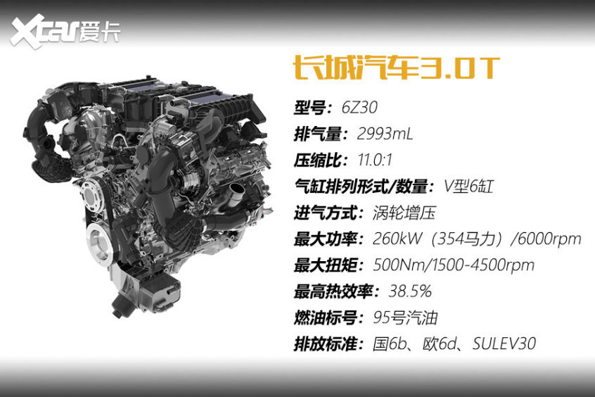动如脱兔,静若处子,二者看似矛盾,实际上可以兼顾。为此,长城汽车打造了全新3.0T汽油发动机,其代号为6Z30。这款3.0T发动机采用V型6缸布局和米勒循环,并配备了两颗涡轮增压器。两排气缸采用60度夹角设计,主要为了控制发动机宽度,车型适配性更强。