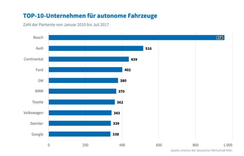 根据科隆经济研究所 (IW) 的一项研究,德国制造商拥有全球自动驾驶专利的 52%, 前十名中有六家来自德国公司。