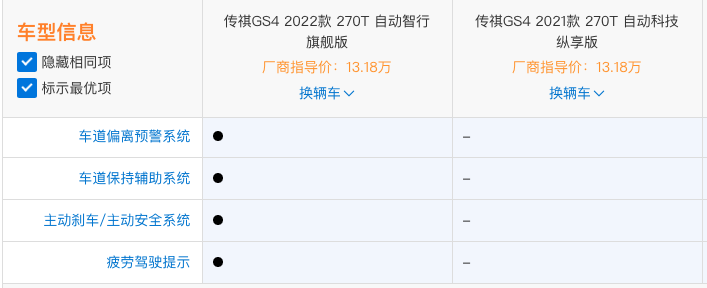 广汽传祺经过市场调研发现,其实消费者选择GS4,更容易介绍13.18万元的次顶配,因此在2022款车型中,广汽传祺将顶配价格定在了13.18万元之上,与老款13.18万元车型相比增加配置包含:车道偏离预警、车道居中保持、AEB主动刹车、疲劳检测、自适应巡航系统、电动感应尾门、前排座椅加热、手势控制、人脸识别、苹果CarPlay与百度CarLife手机互联、自适应远近光、全车车窗一键升降。但也有些老款应有的配置在新款中被取消掉,甚至简配。比如方向盘从真皮变为皮革、取消了前排手机无线充电、全车4个USB接口变为2个、前排手机无线充电、后排隐私玻璃以及分区空调没有了。