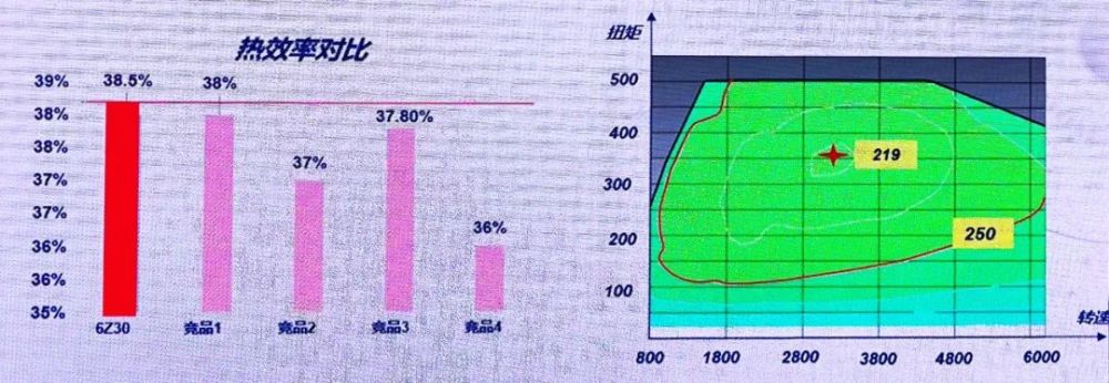 ●高效都已经2021年了,如果你还认为高性能是以高油耗为代价的,那你就OUT了。6Z30的热效率甚至比去年发布的2.0T发动机还略高一些,达到了38.5%,而相比竞品中最高的38%,依然存在着明显的优势。此外,搭配P0或P2电机后,它的250g/kWh 油耗区域占比超过70%,这也就意味着,在大多数工况下,6Z30都能保持良好燃油经济性。