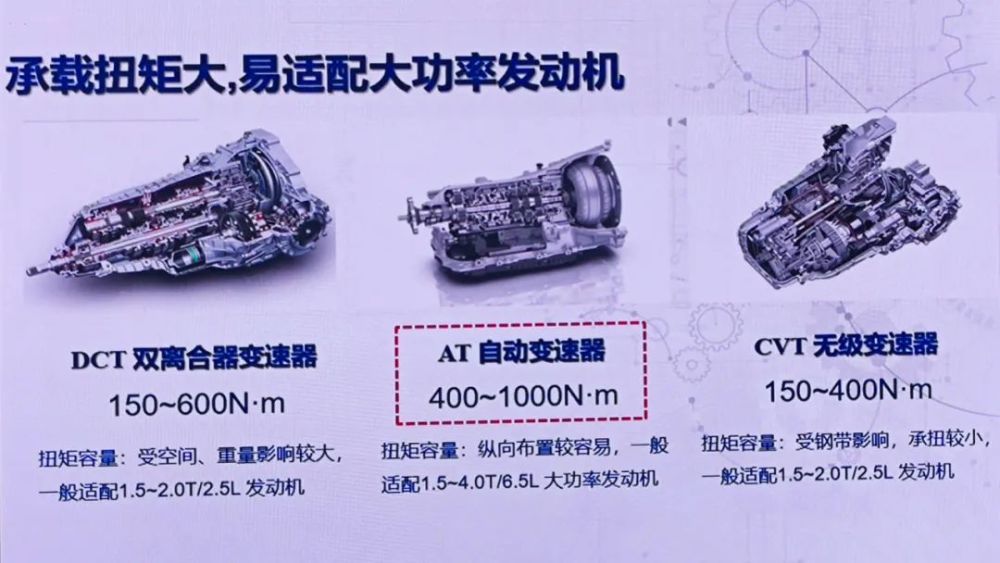 那为何不是9DCT呢?这还要从不同变速器的特性上来看,从承载扭矩这块来说,DCT 变速器可承受的最大扭矩大多在150~600N·m,而AT变速器则高达400~1000N·m,比 DCT 更适合大功率发动机。