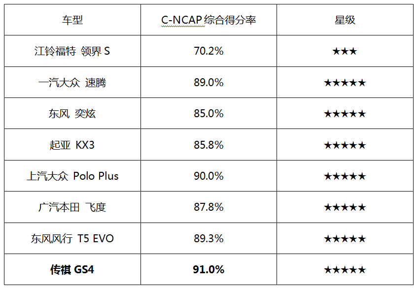 在2021年C-NCAP碰撞的“成绩单”中,传祺GS4凭借91.0%的超高综合得分率,不仅加冕五星评级,更成为 10万级车型中安全性No·1的存在,甚至赶超不少同价位合资车型,证明了自身五星成绩的 “含金量”更高。