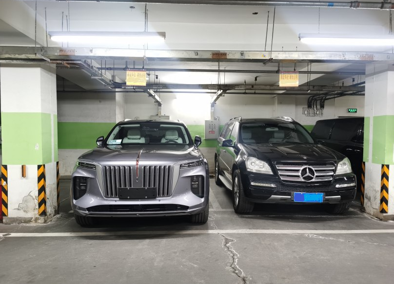 车主把红旗E-HS9开回公司后遇到了隔壁公司老板的座驾——奔驰GL450,这款车是奔驰GLS的前身,当年100多万元买的,也是大型SUV,停在一起后对比鲜明,随后车主随手拍下了对比照片,还别说,红旗E-HS9看起来确实很漂亮,或许是停放位置有偏差,显得奔驰GL450小了一圈,整体差别不大。