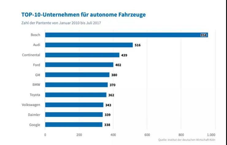 根据科隆经济研究所 (IW) 的一项研究,德国制造商拥有全球自动驾驶专利的 52%, 前十名中有六家来自德国公司。