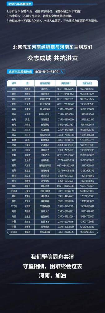 1、开通400电话专属通道:针对郑州及其他受灾地区,开通400话务专线并安排专职客服团队,24小时值守提供援助指导。(北京汽车服务热线400-810-8100)