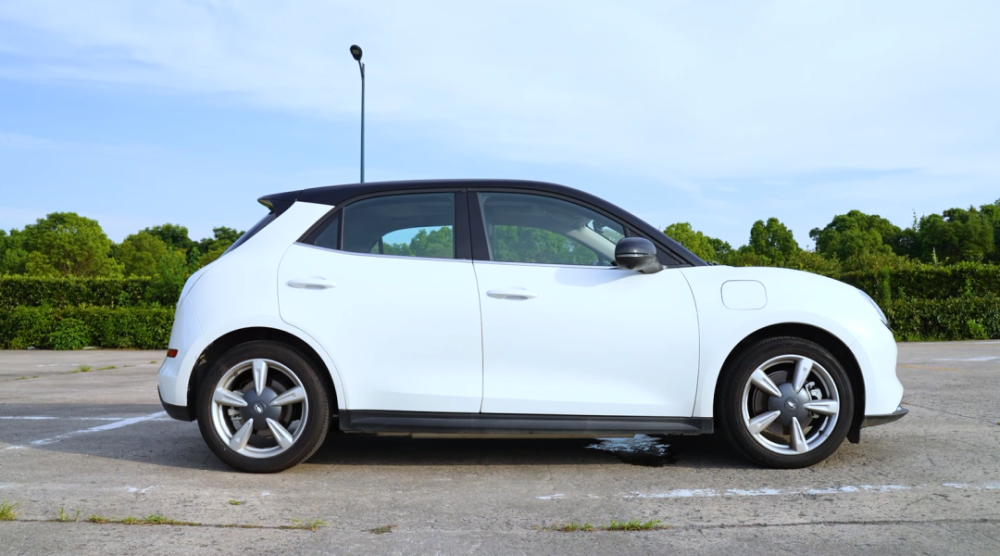 欧拉好猫的侧面以平滑的线条勾勒出圆润的车身造型,虽然定位为小型车,但轴距却达到了2650mm,配合下方带有复古气息的18英寸五辐花瓣式轮毂,令整个车身侧面精致中又不失灵动可爱。