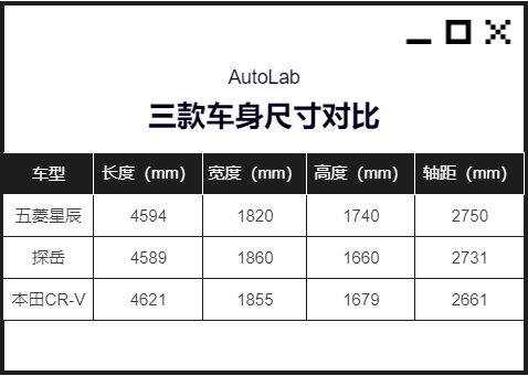 尺寸方面,根据工信部资料,星辰的长高宽分别为4594/1820/1740mm,轴距2750mm,在紧凑型SUV里,比探岳更出色,跟本田CR-V相比也是互有优势。