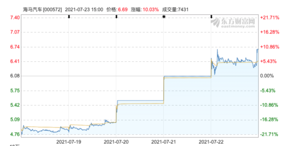 在与一汽宣布“分手”后,海马汽车一连在3个交易日连收3个涨停板,7月23日收盘价为6.69元,总市值110亿。