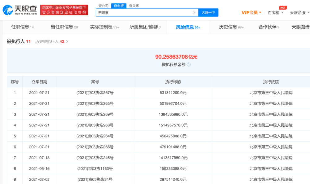 值得注意的是,在FF上市前夕,贾跃亭又新增了6条被执行人信息,目前累计被执行总金额已高达90.26亿元。