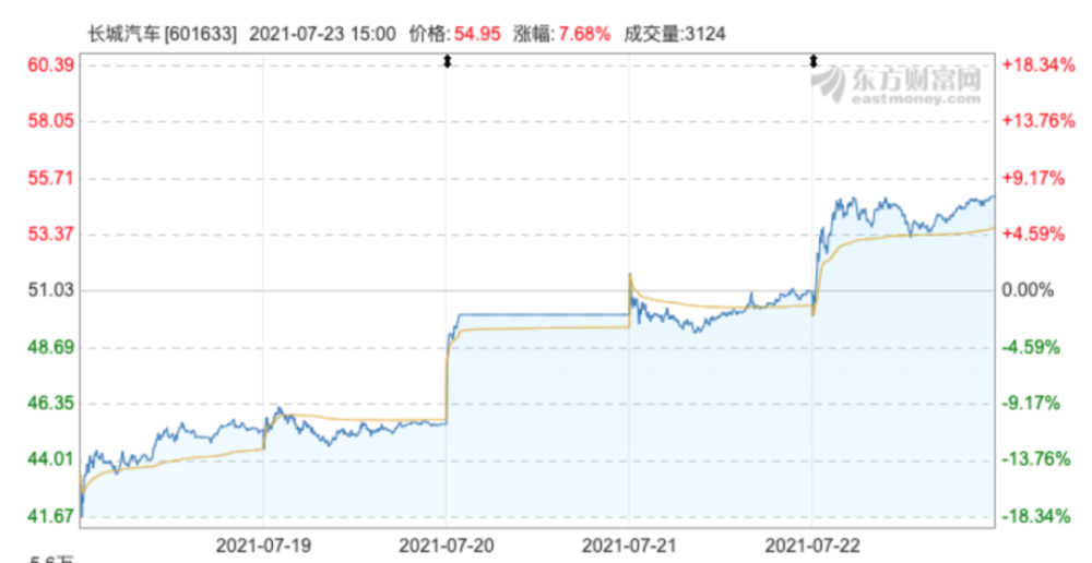 截至7月23日收盘,长城汽车(601633)收报54.95元,涨7.68%,总市值5057亿元。