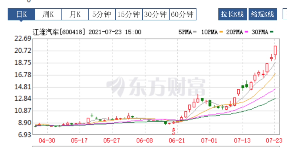 从今年6月中下旬起,江淮汽车的股价一路上扬,7月23日又是一个涨停收盘,如今市值已然突破400亿元。