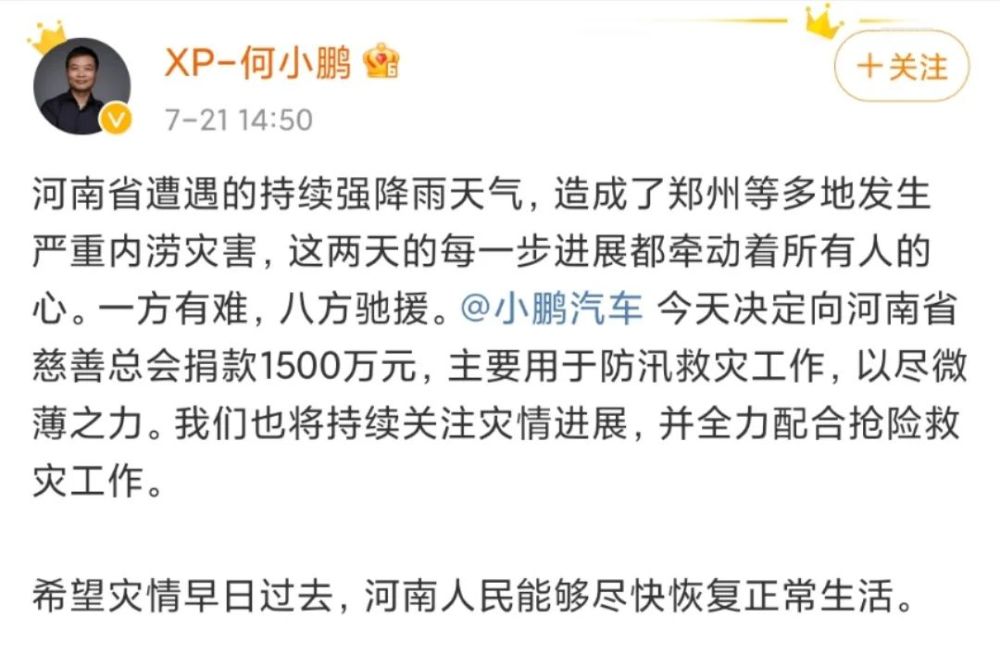“一方有难,八方驰援。@小鹏汽车今天决定向河南省慈善总会捐款1500万元,主要用于防汛救灾工作,以尽微薄之力。”当日,小鹏汽车董事长何小鹏在微博中写道。