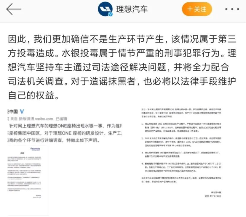 7月20日,理想汽车表示,涉事汽车主、副驾驶座椅均有大量液态水银,但却否认水银系车辆生产环节投撒。