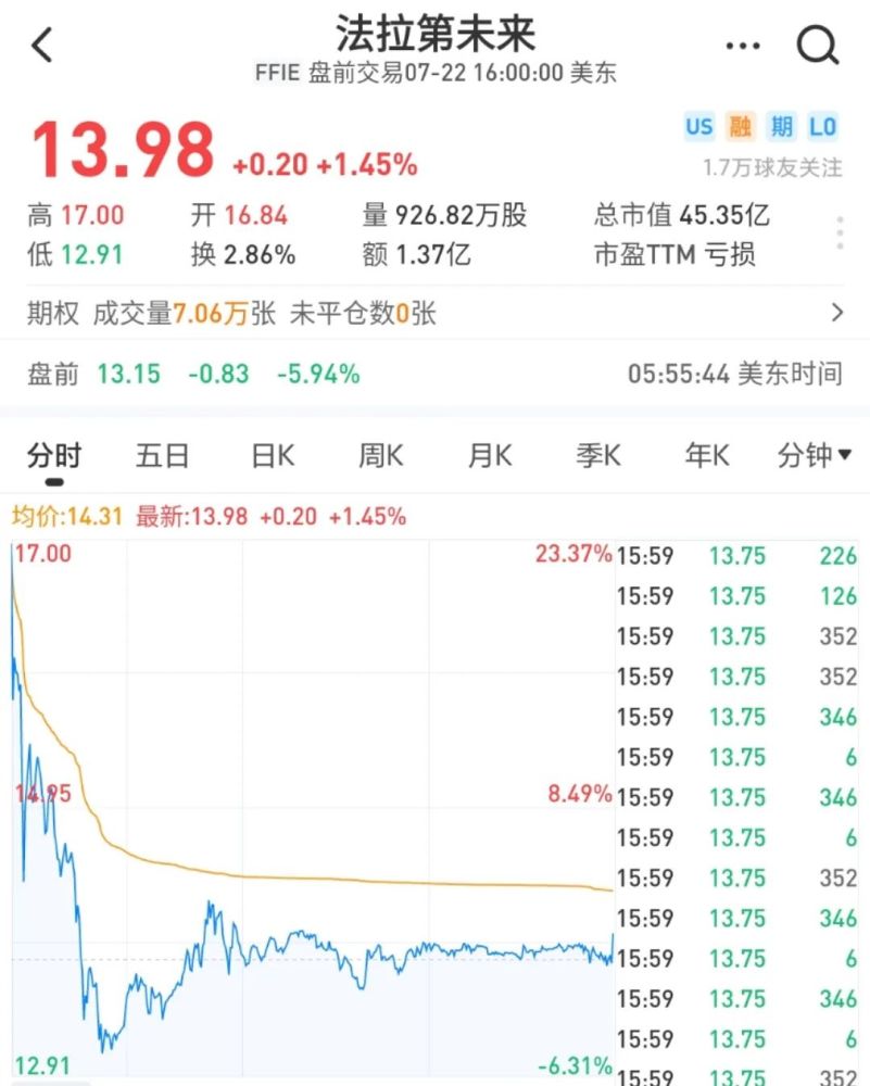 FF上市发行价为13.78美元/股,开盘涨幅一度超过20%。随后,股价开始下跌,一度破发,继而反弹震荡,截至当地时间美股收盘,其股价为13.98美元/股,涨幅1.45%。