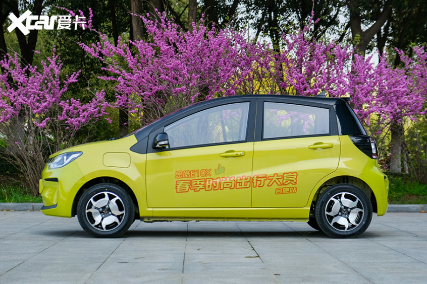 思皓E10X非常小巧,它是一款标准的A00级车型。车身尺寸为3650mm×1670mm×1495mm,轴距则是2390mm。从侧面的造型我们能够看出思皓E10X与江淮新能源iEV6E有一定的继承关系。车身上半部分采用了黑化处理,形成了双拼色的效果,更显时尚。