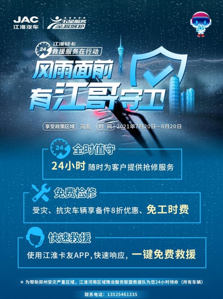 水灾无情人有情,面对此次突发的河南水灾,江淮轻卡在组织全国各地服务站救援队伍抢险救灾的同时,还为赈灾支援车辆提供绿色通道服务,优先保障赈灾车辆服务工作;区域服务商24小时值守,随时为客户提供抢修服务,无条件优先响应,即呼即到;服务商成立救援小组参与社会救援,免费救援、免费提供应急餐饮支持;针对洪灾需要救援的车辆,服务商实施免外出费救援政策。