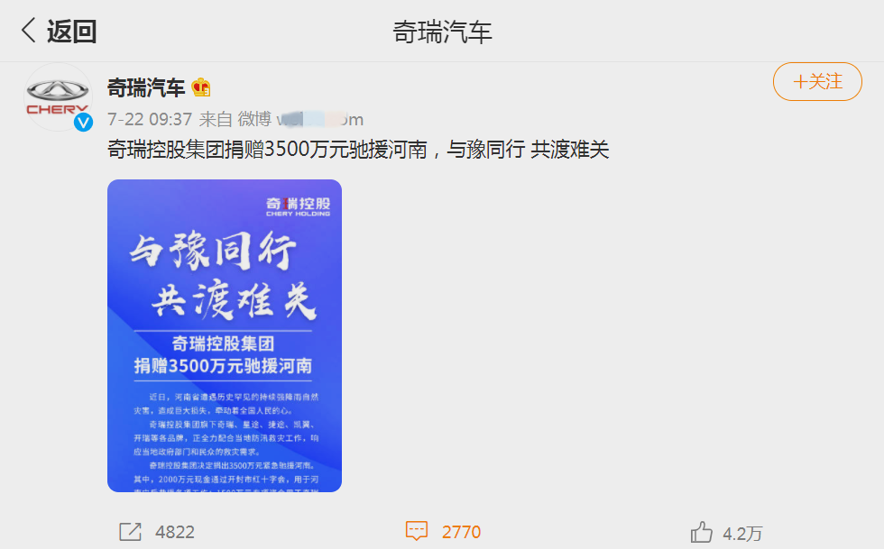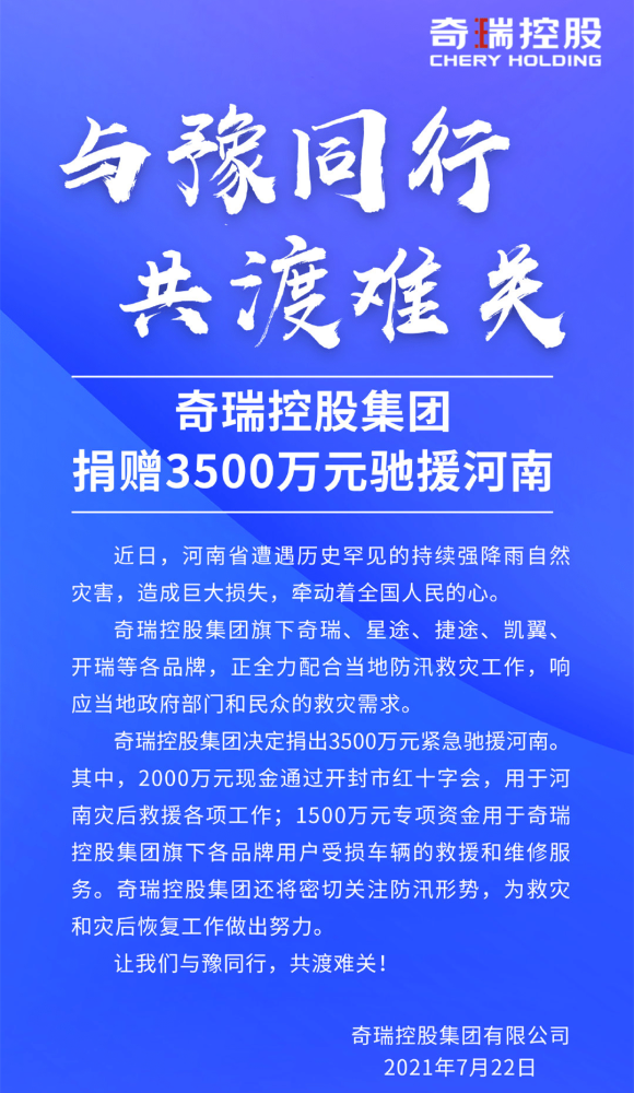 我们从奇瑞官方渠道获悉,奇瑞控股集团在这次河南抗洪救灾行动中,共计捐献出了3500万救济款项。