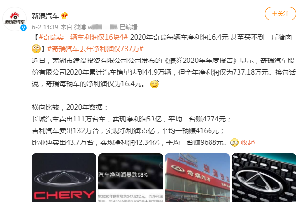 对于如此优秀的奇瑞汽车品牌,虽说近年来汽车销量在不断增长,但是奇瑞集团的净利润却低于行业水平以下。