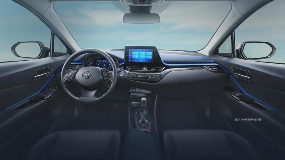 虽然不像外观那么犀利,但C-HR双擎的车内同样不乏看点。除了大面积的黑色内饰,双擎版车型还有一条专属的“星幻蓝”饰条贯通整个驾驶舱,也让车内显得不那么单调。