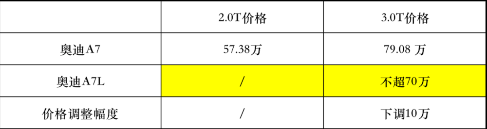 需要注明的是,奥迪A8L目前没有2.0T版本,所以价格上坚挺一些,价格高度达到70万左右,长期的国产促销让奥迪A6L无论如何也探不到这一高度,但奥迪A7L首批上市的3.0T版本,价格正好不超过70万。