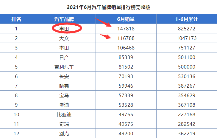 差距这么大,为什么丰田依旧可以2年时间完全超越大众品牌在华总销量?因为最新6月份,丰田品牌在华的单月总销量第一次超过大众品牌,14.78万台比大众的11.68万台多出26%!两年之内完全可以超越。