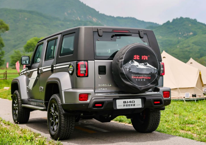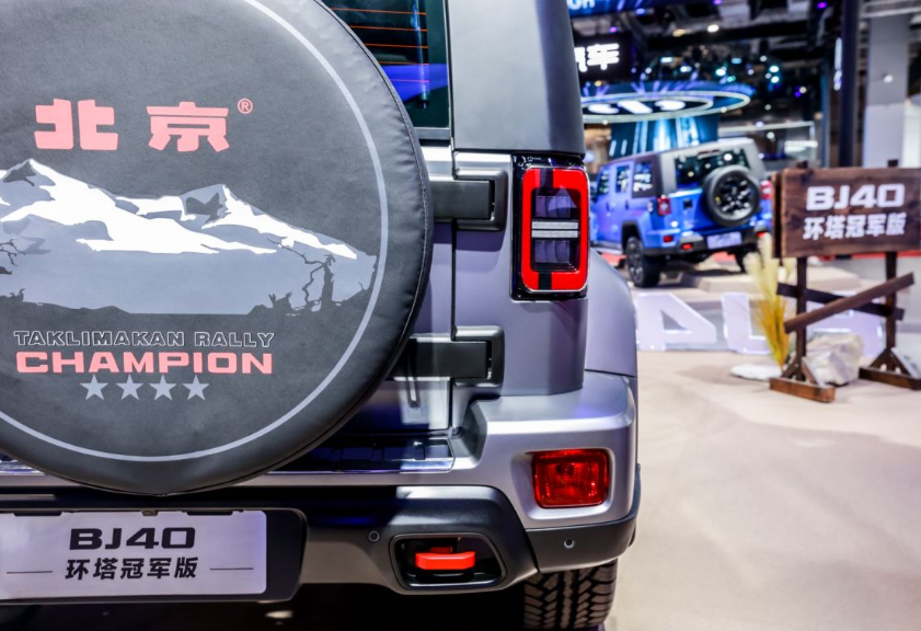 从尾部设计来看,BJ40环塔冠军的备胎罩是以塔克拉玛干沙漠的景观,远山和胡杨为背景进行创作的,搭配上红色的logo北京的字样,品牌的辨识度相当的ok。我相信如果你驾驶着BJ40环塔冠军,一定会成为街上最酷的潮人,而且这辆车子的细节也把握得相当不错,特别的吸睛。