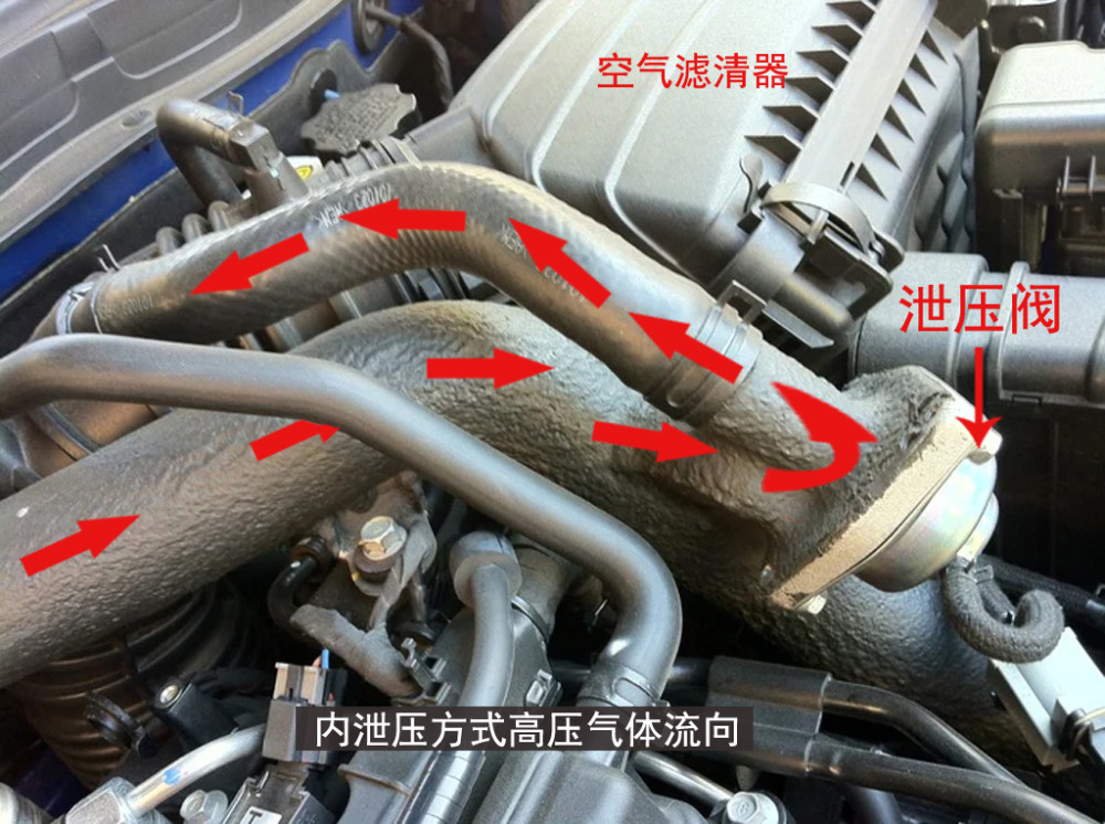 由于泄压阀泄压时气流速度很快,会产生一定的噪音,家用车会把泄压阀排出的气体引导至进气系统前端的低压区,这称为“内泄压”,这样可以尽量降低泄压时的噪音。家用车都是采用内泄压方式,所以我们平时开车时很难听到泄压阀的声音。