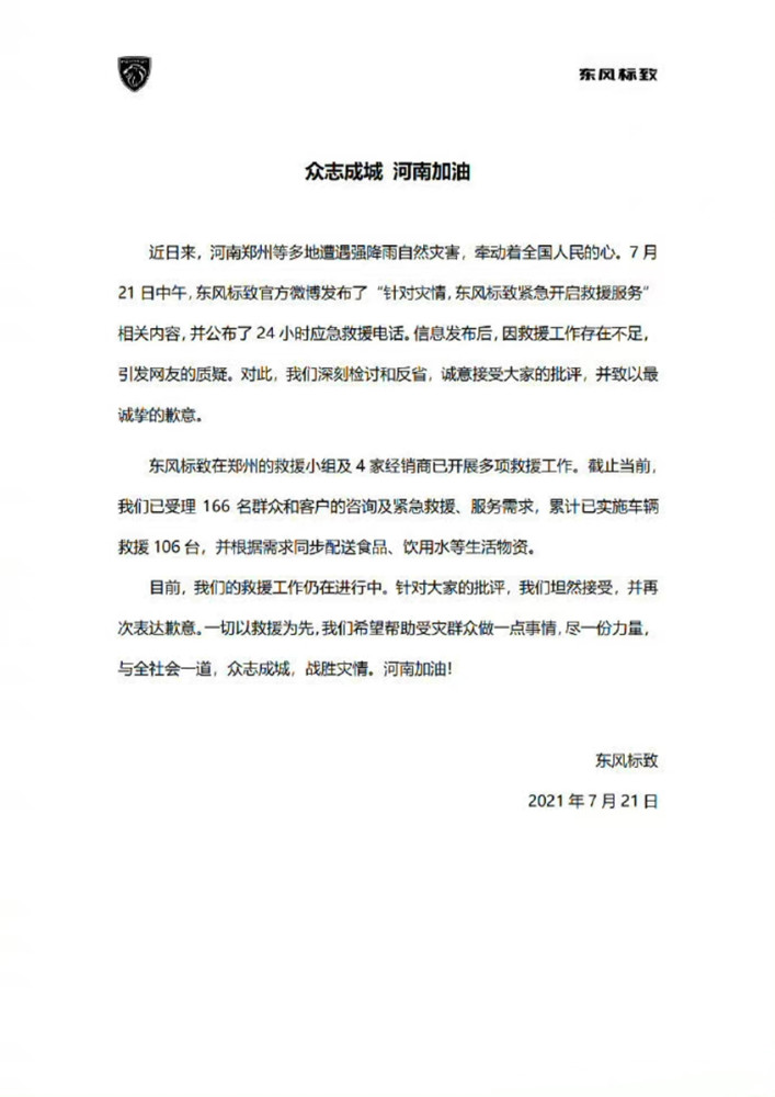 就在众车企纷纷捐款、发布爱心计划驰援河南的时候,7月21日中午,东风标致发布了“针对灾情,东风标致紧急开启救援服务”相关内容,并公布了24小时应急救援电话。但是在信息发布后,因救援工作存在不足,引发网友的质疑。对此,东风标致通过官方微博进行致歉,表示将深刻检讨和反省,诚意接受大家的批评,并致以最诚挚的歉意。