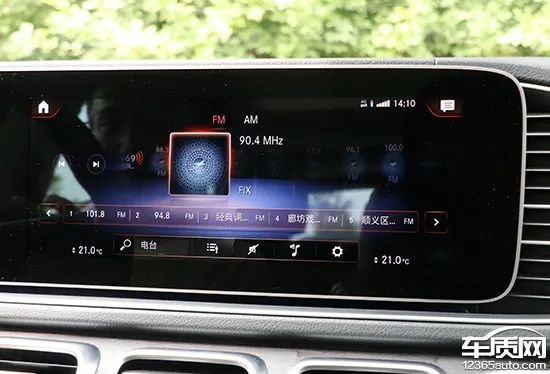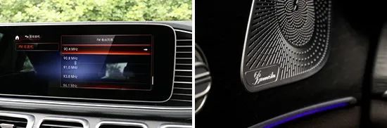 对于日常使用最多的收音机功能我们也进行了测试,直接点击主菜单中的“收音机”选项进入收音机功能主界面。奔驰GLE的车载收音机界面十分简洁,底部为收藏列表,长按可以打开菜单,可选内容十分丰富,包括删除电台、替换电台以及添加至收藏夹等。收音机支持手动输入频率调台,此外也支持自动搜索。电台收藏列表最多可添加20个,完全能够满足日常使用。试驾车配备柏林之声音响系统,带有13个扬声器,音质表现相当出色。