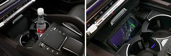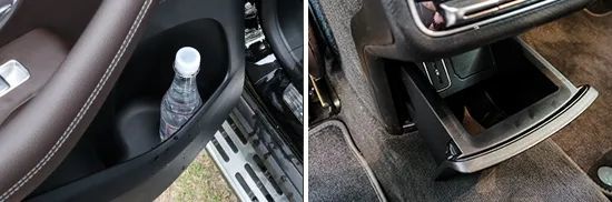 奔驰GLE前排储物空间十分丰富,并且位置设计也很合理,基本都在随手就可以触及到的地方。前排门板储物槽带有空间划分,位置也并没有过分靠下,拿取物品比较轻松。中控台下方设计有储物槽,底部带有无线充电板,后方为两个带限位器的杯架。这部分区域还设计有盖板,关闭之后显得十分规整,而且放置其中的小件物品也很稳妥。不过,当杯架放置水瓶后,就会与前侧的储物槽产生干扰,拿取手机或是其它物品时会比较不便,因此这部分区域还存在优化空间。