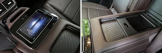 后排杯架的位置被设计在前排中央扶手后侧,拿取水瓶时总是需要往前“够”一下,并不是很方便。此外,杯架还采用了一大一小的配置,其中只有大尺寸的杯架带有限位器。后排门板储物槽设计与前排一致,带有空间划分,容积也比较客观。后排空调控制面板下方设计有一个伸缩式储物格,虽然容积并不大,但私密性很好,并且内部还带有Type-C接口。后排中央扶手尺寸很大,前侧为储物槽以及多媒体控制系统,后侧是储物槽以及带盖板的储物格,实用性表现相当出色。