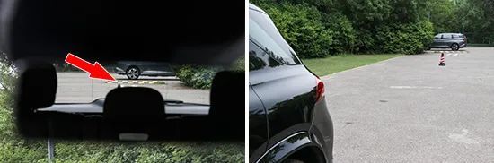 后方视野测试中,依旧将桩桶固定摆放,随后移动车辆直至可以观察到桩桶上沿为止,所测得的距离为1434cm。需要注意的是,由于第二排座椅中间头枕位置偏高,因此对内后视镜的观察范围产生了较大影响,遮挡情况十分严重。