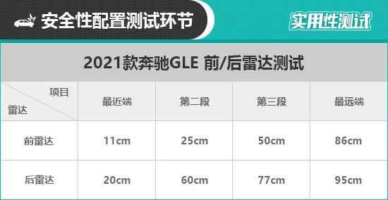 在测试过程中,奔驰GLE的后倒车雷达在95cm处开始感应到后方物体,探测距离比较近。后续每段距离间隔掌握也比较一般,好在提示音蜂鸣比较清晰。参考往期测试经验,持续蜂鸣阶段越接近25cm则越贴近日常使用习惯。从实测数据来看,奔驰GLE后侧雷达的最近提示距离为20cm,相较日常使用习惯更近一些。考虑到奔驰GLE中大型SUV的定位,车身尺寸比较大,因此在日常使用时需多加注意,要保留出足够的安全余量。