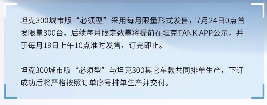 坦克300城市版自上海车展亮相以来,与主流城市SUV相比,坦克300城市版以时尚鲜明的造型设计及智能舒适的越级配置,在尺寸、动力、通过性方面优势明显。操控性能方面,依托于坦克平台、同样搭载非承载式专业越野底盘的坦克300城市版,拥有超强的通过性,吸引众多消费者的关注。7月23日晚,坦克品牌正式公布了坦克300城市版车型的价格,新车共推出3款配置,售价区间为20-23万元,其中顶配的必须型为限定款,以每月限量方式发售。