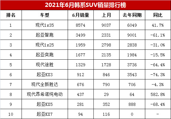 【2021年6月韩系车销量排行榜 韩系SUV销量排名】这几年韩系车市场销售低迷,6月份韩系SUV销量也不理想。据购车网编辑整理统计显示,2021年6月韩系SUV批发销量还不到2万辆,只有1.94万辆。与去年同期相比,6月份韩系SUV销量下降32.7%。与5月份相比,销量下跌3.6%。