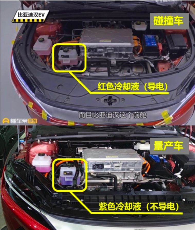 这里我要着重说一下比亚迪官方提出的质疑,那就是冷却液颜色不一致,红色冷却液是导电的,这也是碰撞车所配备的;而实际量产车上搭载的是紫色冷却液,也就是不导电的,没有任何安全隐患。