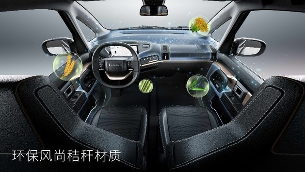 KiWi EV内饰大面积采用稻谷秸秆植物纤维环保材料,减少车内异味同时还带来独特的视觉纹理效果和极佳手感。同时,KiWi EV全系标配PM2.5空气清新系统, PM2.5颗粒净化率98%以上。