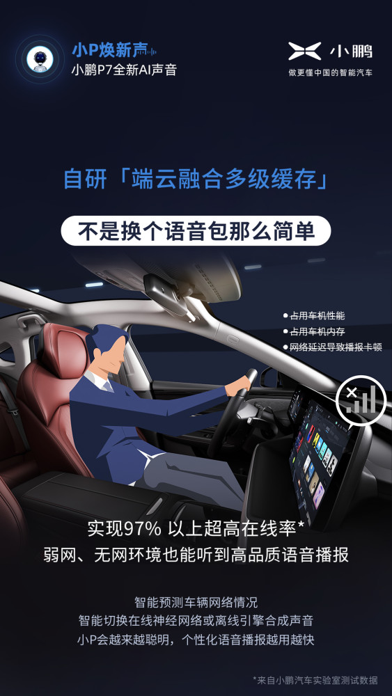 更极致——通过小鹏汽车自研的端云融合多级缓存技术,车辆可预测当下的网络情况,智能选择在线神经网络引擎或离线引擎进行声音合成,在弱网或无网络环境下,依然带来高音质语音播报。同时,通过一系列创新性落地解决方案,包括智能预测算法、智能拼接等,可做到97%超高在线率。