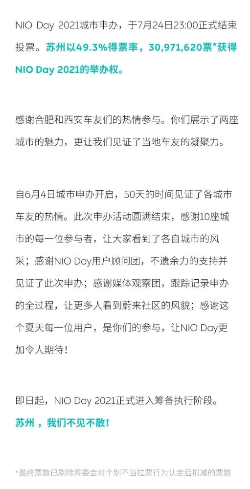 据悉,NIODay的申办需要城市车友会牵头,并满足8年内没有举办过NIODay、场馆档期和容量允许等要求。此次共有10个城市进行了NIODay2021申办陈述,包括长沙、广州、哈尔滨、海口、合肥、苏州、天津、武汉、西安、郑州,最终合肥、苏州和西安脱颖而出。7月23日7:00-24日23:00之间,蔚来用户通过投票决定,最终苏州胜出。