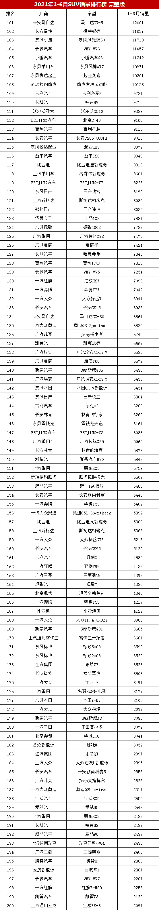 【2021年1-6月汽车销量排行榜 上半年SUV销量排名】据统计,2021年1-6月国内SUV市场批发销量达到468.8万辆,相比受疫情影响的2020年上半年增加了103.3万辆,同比增长28.3%。下面,购车网编辑带大家去看看2021年1-6月313款SUV车型批发销量及其排名情况: