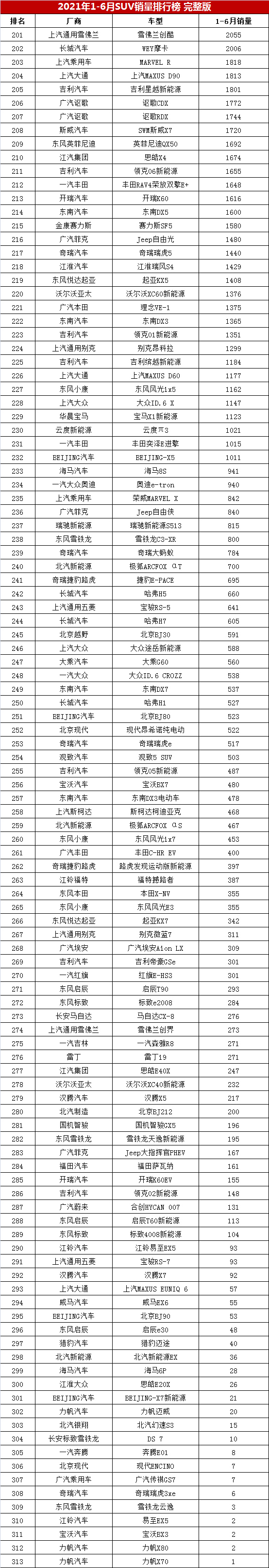 从上半年累计销量超过6万辆的21款车型来看,自主品牌共有9款车型,而合资品牌则占据了12席,依然领先于自主品牌。2021年1-6月313款SUV车型的批发销量及其排名情况,详见下表: