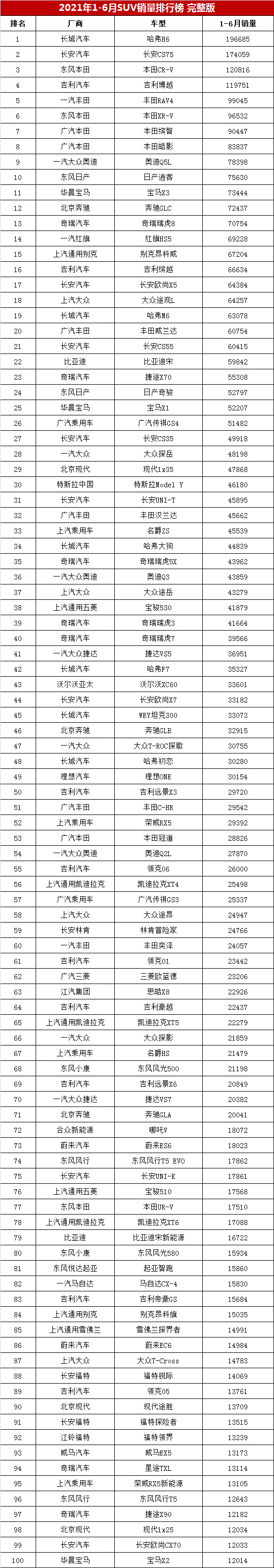 数据显示,2021年上半年累计批发销量超过6万辆的SUV共有21款车型,其中累计销量超过10万辆的SUV共有四款车型。哈弗H6依然是SUV销量冠军,上半年累计销量达到196685辆,领先优势进一步扩大。长安CS75累计销量174059辆,排名稳居第二位。