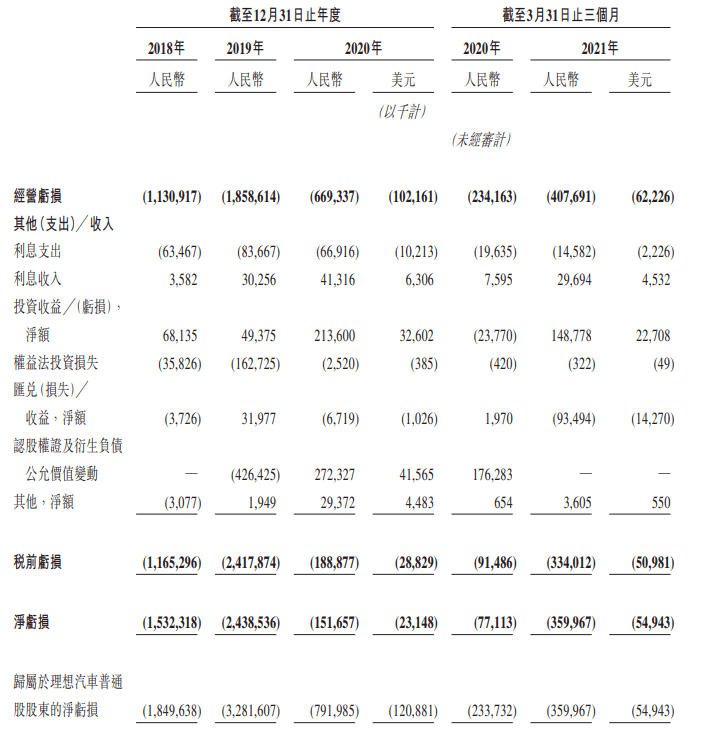 根据招股书披露,理想汽车收入增加主要归因于汽车累计销量的增加,使充电桩、配件及服务的销售亦随之增加。理想汽车的研发费用由截至2020年3月31日止三个月的人民币1.9亿元增至截至2021年3月31日止三个月的人民币5.15亿元(78.5百万美元),主要归因于2021年1月授予的增量股票期权。公允价值更高导致所产生的股份支付薪酬费用增加,而2020年第一季度未就具有服务条件及IPO相关的绩效条件的股票期权确认股份支付薪酬费用;新车型研发活动增加;及雇员人数的增加。