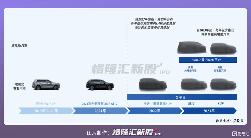 据聆讯后资料显示,理想汽车正在开发X平台,它继承了理想ONE现有的增程序电动汽车平台,并配备了下一代增程电动动力系统。公司计划于2022年推出X平台上的首款产品——全尺寸豪华增程序电动SUV,并于2023年在X平台上推出另外两款SUV。