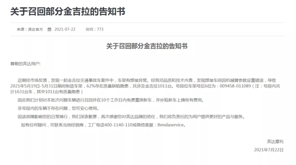 在奔达的“关于召回部分金吉拉的告知书”中提到,由于车架焊接数据错误,让部分批次的金吉拉车架存在安全隐患,在碰撞的时候易发生断裂。