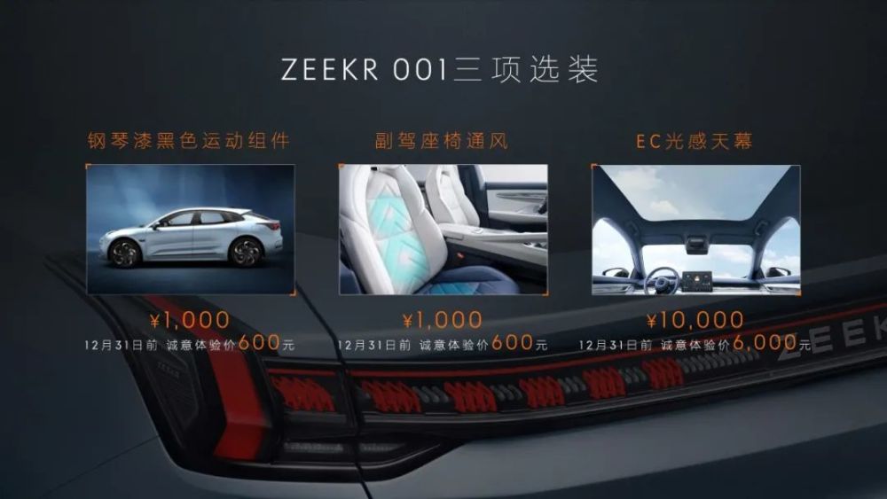 除了这些关注度高的问题之外,极氪也公布了试驾计划,目前第一批试驾招募已经结束了,活动在成都、宁波、北京、珠海四个城市进行,有超过3000名大定用户参与,后期也将陆续在不同城市启动试驾活动, 此外此次APP开放修改的同时,还开放了新增的三项选装,如图所示: