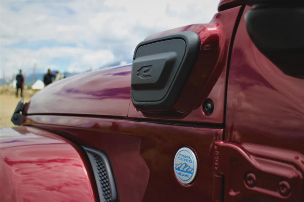 相比燃油版多出来的充电接口,也被设计在了翼子板上方并不显眼的地方,在牧马人4xe身上更像是一个多出来的拓展口,十分和谐。而这个位置也高于760mm的最大涉水深度,在不影响通过能力的同时,最大程度保证了充电口的安全性。