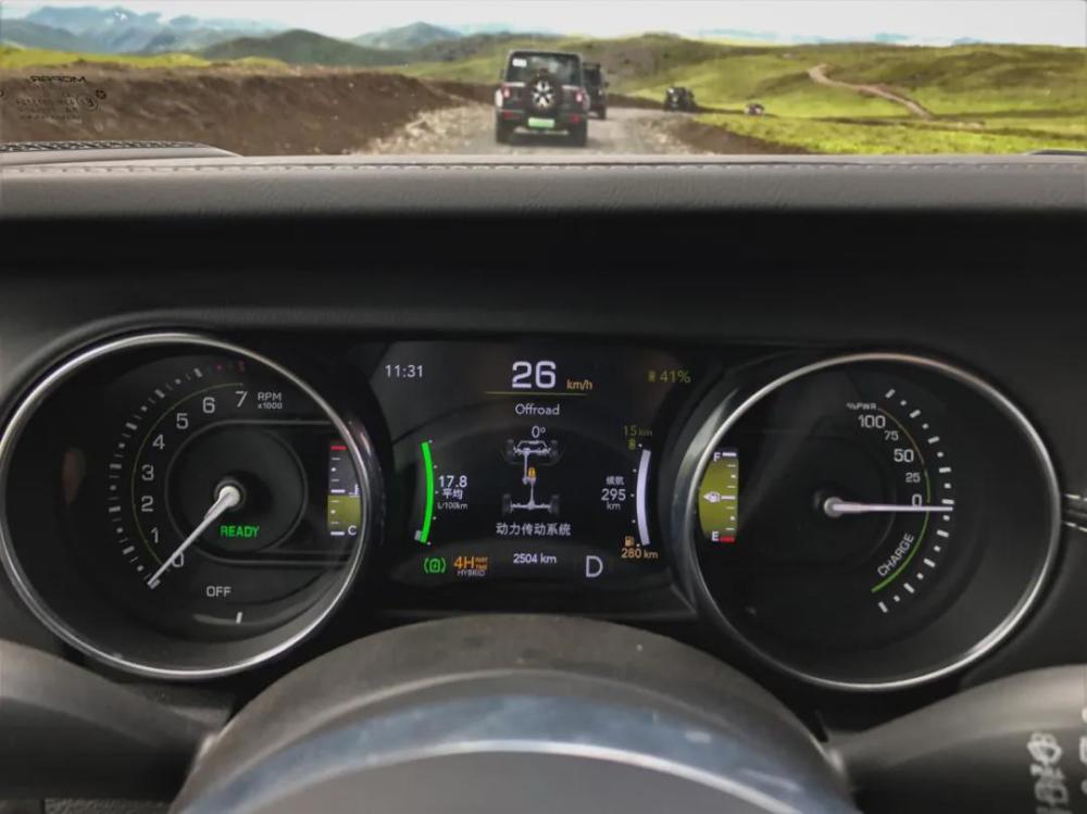 在海拔4000米以上的地方,我开过V8、V6、L4……搭载各式各样发动机的燃油车甚至是柴油车,稀薄的空气让人和车都无法全力输出,如果再遇到个越野或者爬坡路段,缺氧的现象更是明显。所以,当我坐上牧马人4xe的驾驶位时,第一件事便是将方向盘左下方的驾驶模式切换到ELECTRIC(纯电)模式。