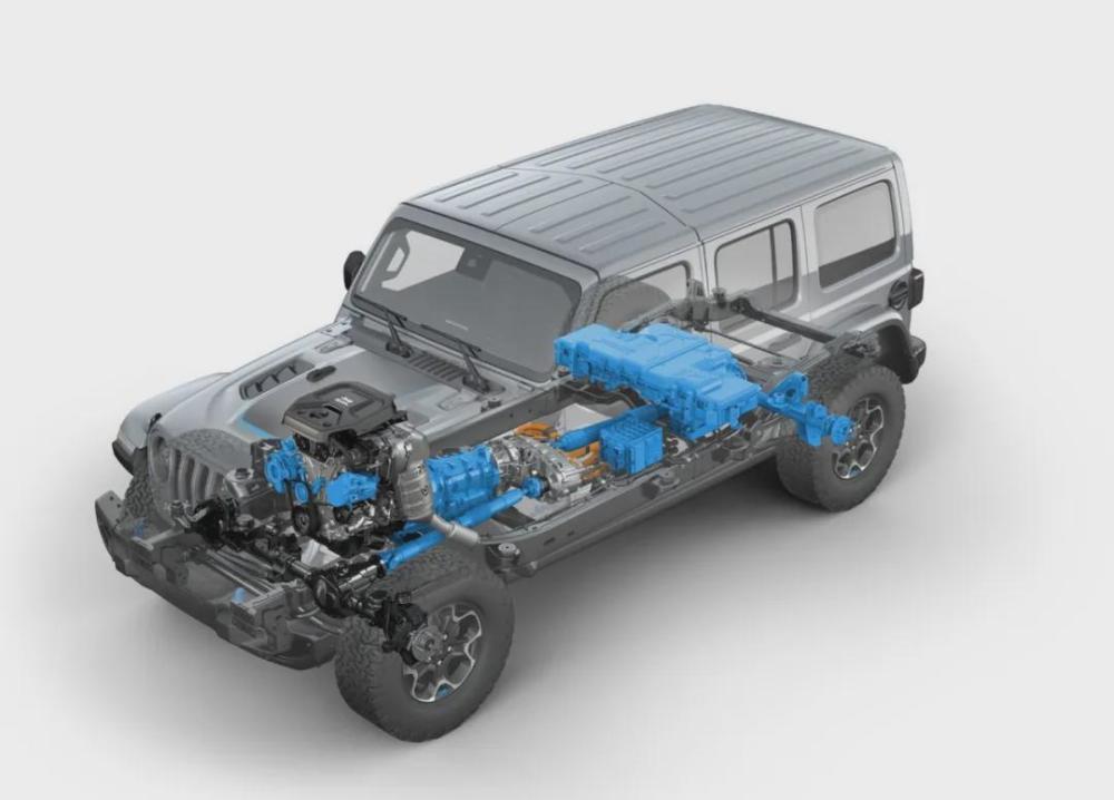 两个电机被一前一后布置在发动机两端,前电机最大功率33kW,最大扭矩53N·m,安装在发动机前方,通过皮带驱动曲轴,可以代替起动机,快速且平稳地启动发动机。后电机位于变速箱输出轴前端,最大功率100kW,最大扭矩250N·m,为传动系统增加扭矩输出,同时还可以为电池充电。在两台电机的“助攻”下,牧马人4xe的综合最大功率达到了275kW(375Ps),综合峰值扭矩达到了637N·m,直接“追平”那台搭载6.4L HEMI V8的牧马人392。